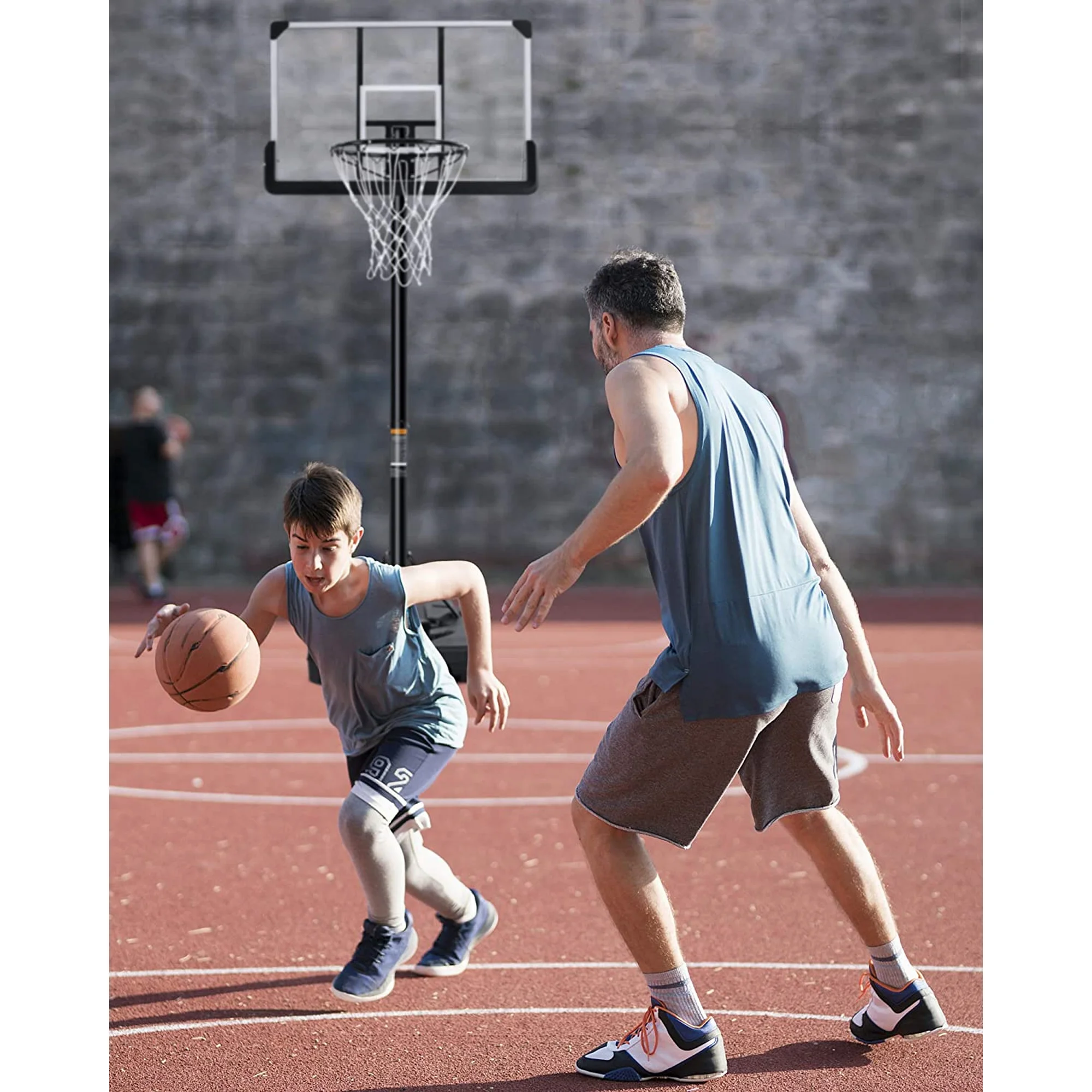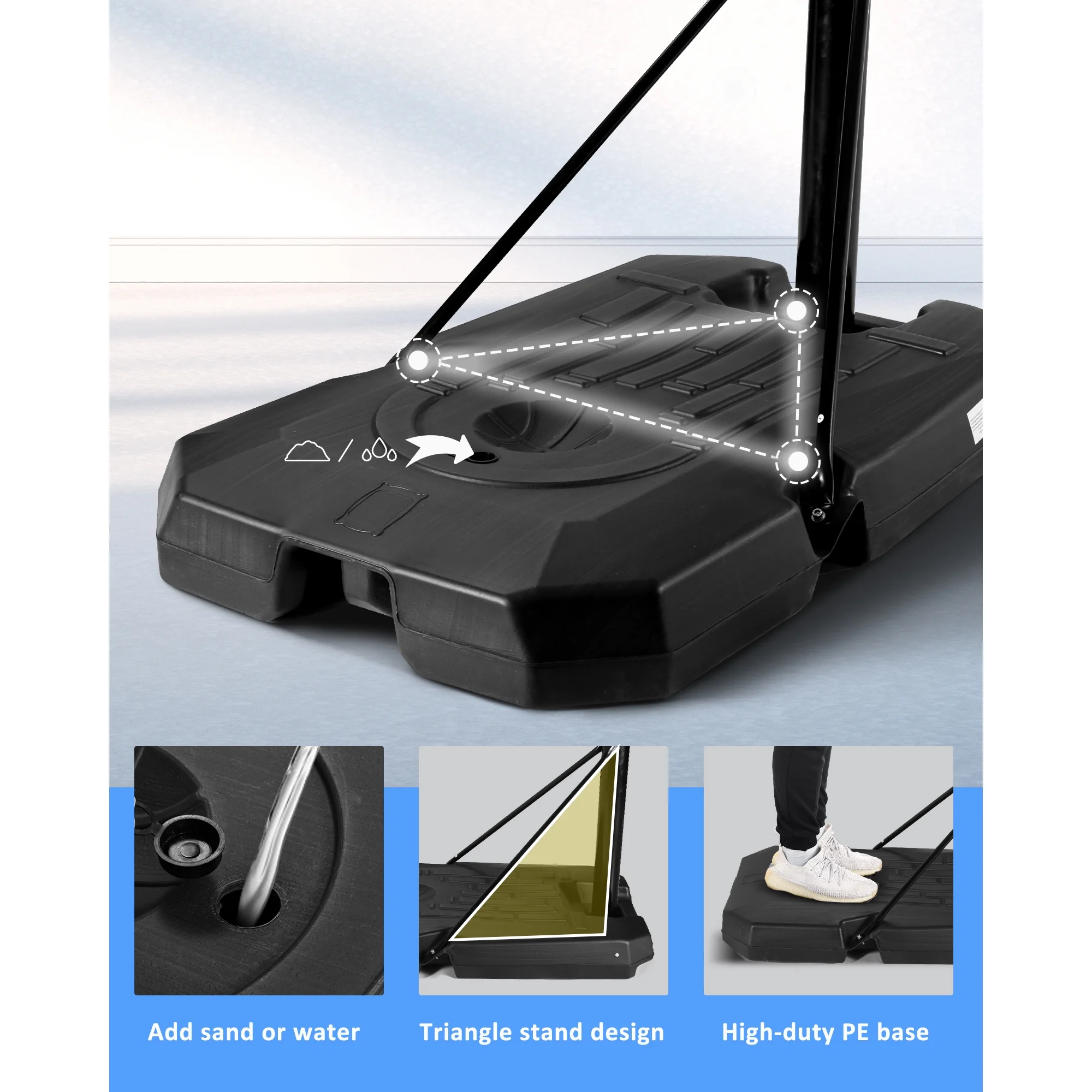 - 【Base Filling & Portable】: The 27-gallon base of the basketball hoop can be filled with 176 LBS of water or 220 LBS of sand to ensure good stability and safety for every shot. The dual bracket works with the elastic and tenacious PE basketball hoop base and pole, creating triangle support (the most stable structure). The basketball hoop is equipped with wheels, which is convenient to move anywhere and anytime