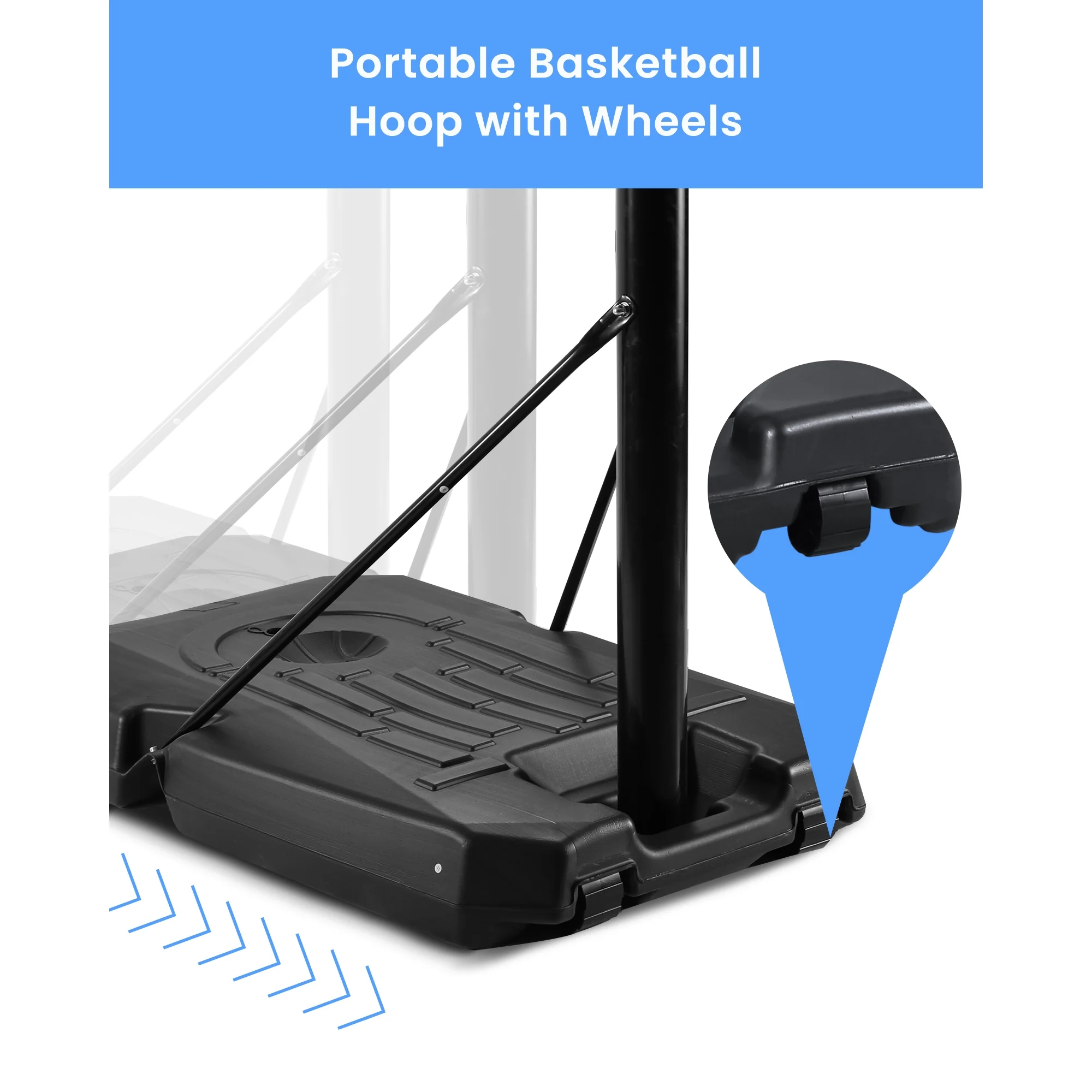Portable Basketball hoop with dual wheels, weighing 21 LBS, for easy indoor and outdoor mobility.