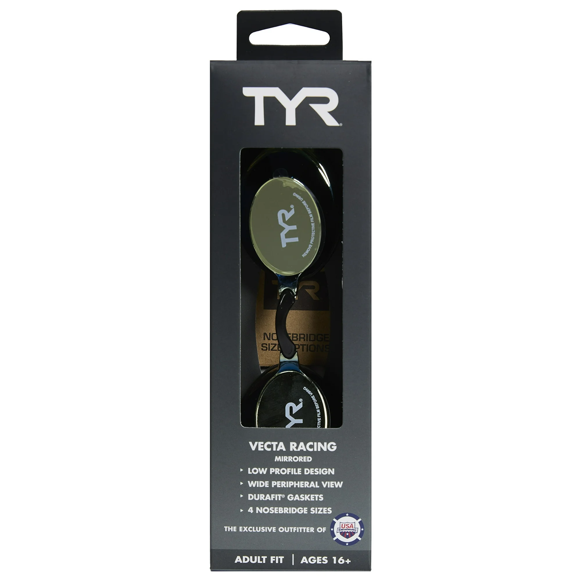 Feel the speed in our TYR Vecta Racing Mirrored Adult Goggles. Engineered for both men and women in competition and training, the sculpted low profile design of the LGVECM swimming goggle ensures a close fit with minimal drag. Lightweight and streamlined, the Vecta’s watertight construction includes DURAFIT® silicone gaskets, wide peripheral range, anti-fog coating, and four removable nosebridge size options. Polycarbonate lenses include full UVA/UVB protection. For Ages 16+
